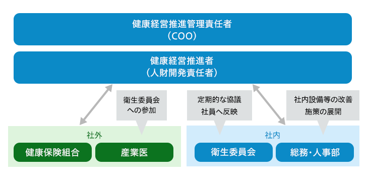 CFOを健康経営推進する責任者として、「健康経営推進者(人事部長)」が社内外と連携し「健康経営」を推進して参ります。